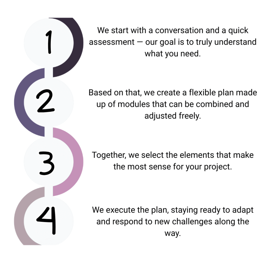 We specialize in bringing order to the chaos — whether it’s communication, content, events, or strategy. We set the direction, build clear and purposeful messaging, and focus on what actually works — no jargon, no detours.